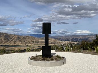 January 2024. A new site-sensitive land artwork joins the permanent collection of Poison Creek Sculpture Project NZ. Developed during the artist's 2023 residency and research into the region’s cultural landscape, ecologies and histories, The Snake Charmer takes root on the slopes of Taraputa (Mt Pisa), above the ancestral Mata-Au (Clutha River). Blending mythology, science, and healing traditions in a striking geometric tableau over 21 metres diameter, the artwork creates a circular energy field. A sea of limestone and medicinal planting for Rongoā Māori circle a black granite figure which is visible through four openings in the regenerating landscape. These apertures mark ley lines between distant mountain peaks, a snake-bend in the awa, and points of significance at Poison Creek.