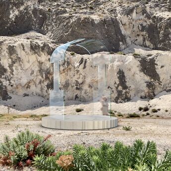 July 2023. Activations from dawn to dusk on Mt Aenos, the highest mountain peak in the Ionion Islands, bind In Absentia to the ancient rock as the glass I-figures reach for the sky. In the Global UNESCO Geopark, Mt Aenos is a designated International Dark Sky Park and Greek national park with unique ecology, biodiversity, and cultural heritage. Bringing the Metaverse to the Mountain, the transient sculpture reflects the mountain's micro-climate, mystically appearing and disappearing on cloud-covered ridges and cypress and pine clad slopes.
